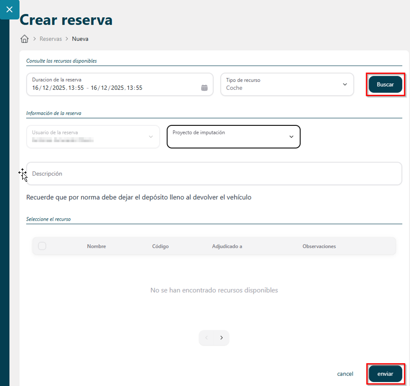 Una vez cubiertos todos los campos, hacer clic sobre Enviar para guardar la reserva.