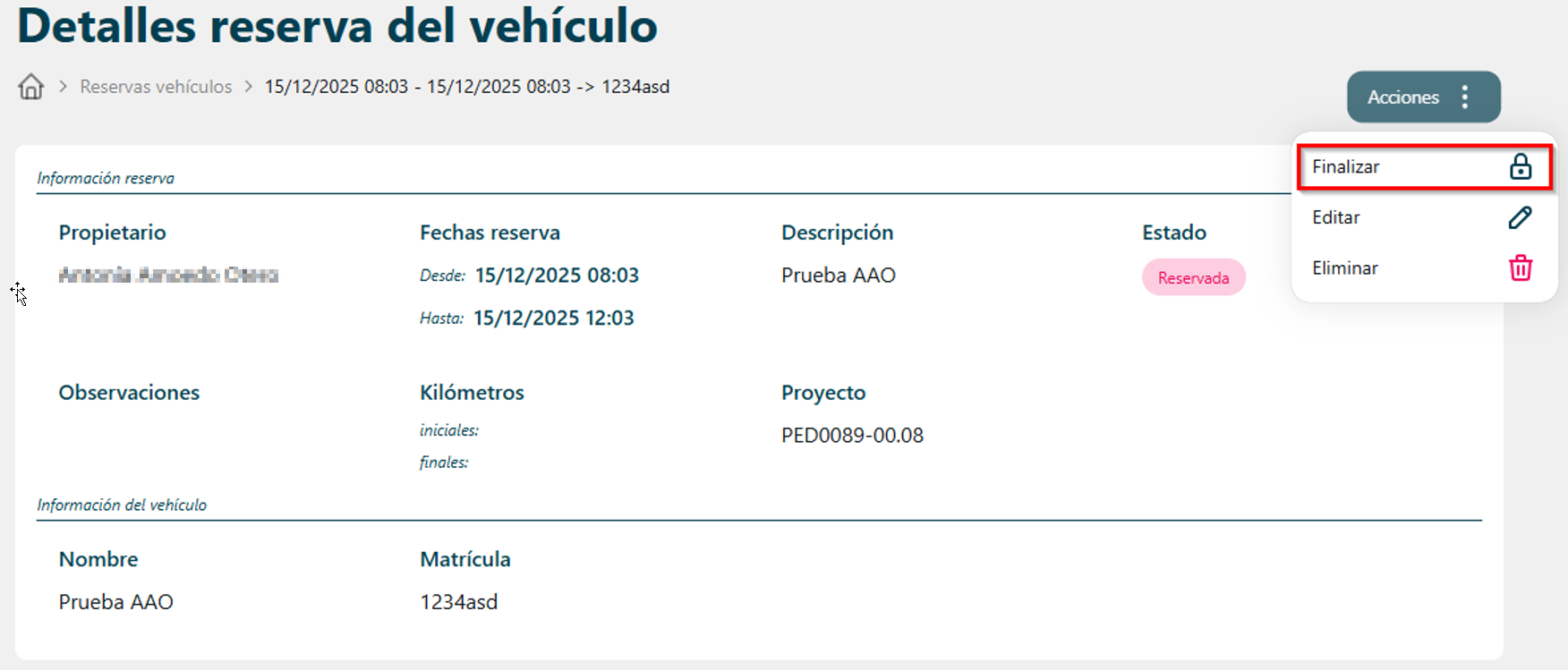 Por otro lado, una vez entregado el vehículo es obligatorio finalizar la reserva en el sistema. Para ello, deberá acceder al listado de reservas, hacer clic sobre los tres puntos de la columna Acciones y seleccionar Finalizar. O, entrando en la reserva, hacer clic sobre Acciones y seleccionar Finalizar.