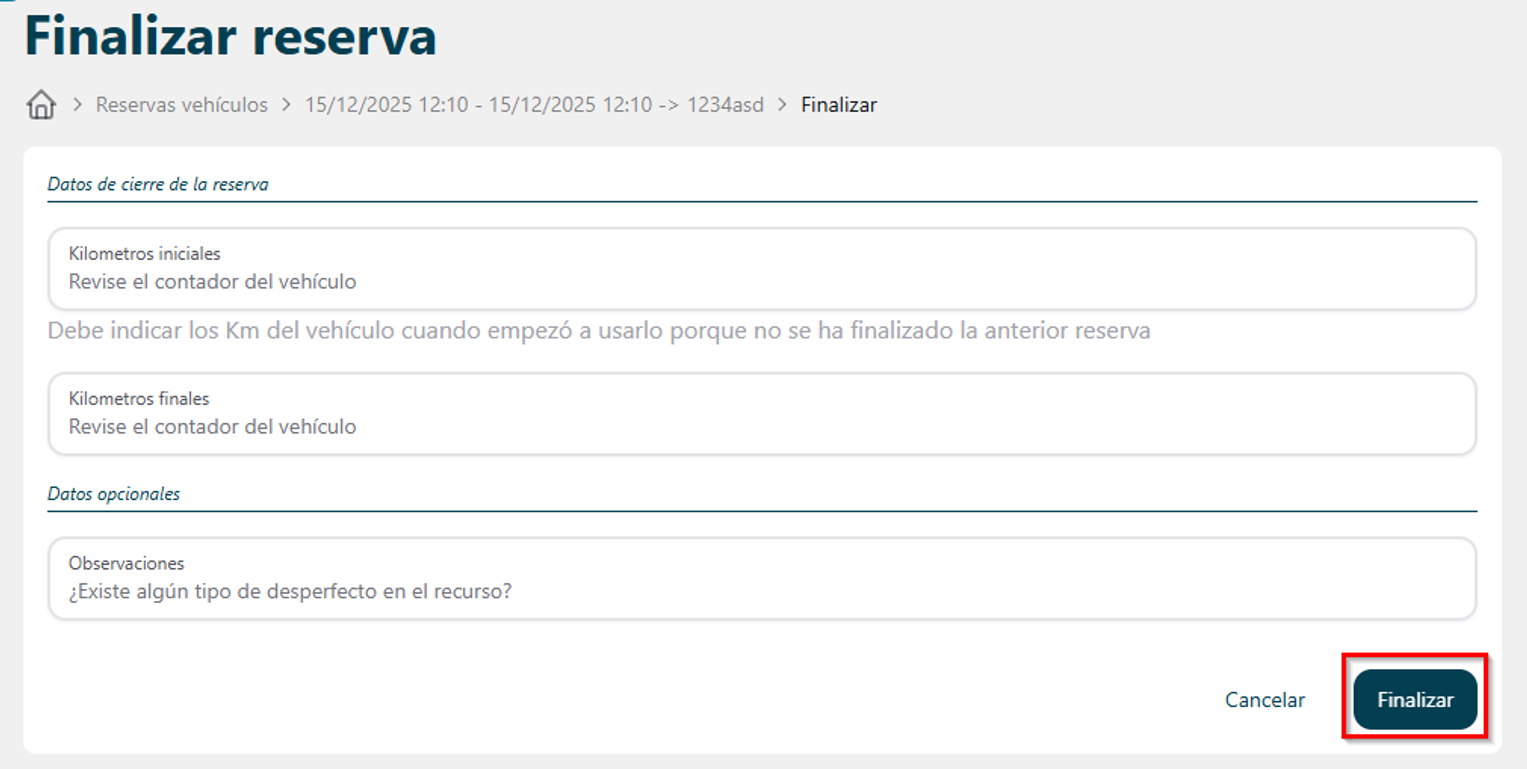A tener en cuenta: si los KMs totales recorridos superan los 1500km por día, el sistema no se permitirá finalizar la reserva.